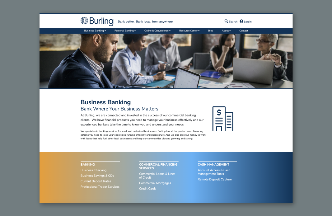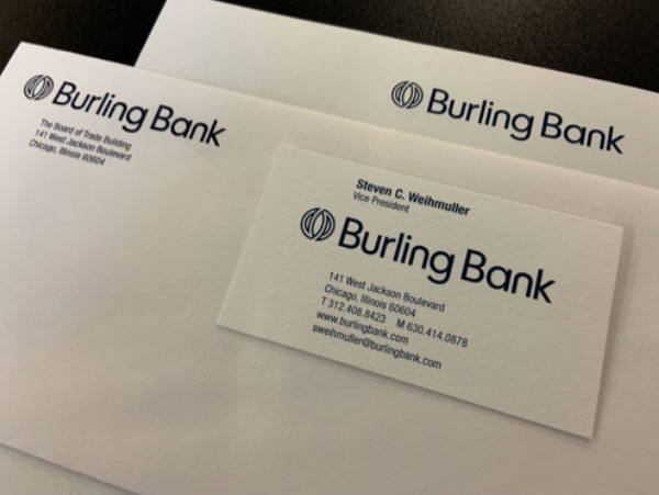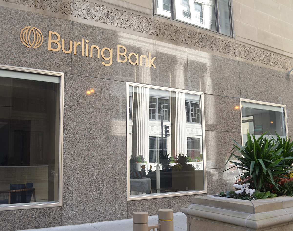 Burling Bank has served the heart of the Chicago financial district in the Chicago Board of Trade for 30 years. The brand has a future-forward focus that manifests in tech-enabled convenience that allows customers to connect and transact from wherever they are. They needed to promote more online access, yet keep their true differentiator as an authentic brand that builds personal relationships with customers and in communities. An imminent office move would soon transform the bank experience from a traditional, interior filled with dark paneling and deep leather tones and to a light, bright modern space. It was the perfect time to work on a new value position and messaging, as well as a new visual identity, logo and interior graphics collaborating with the architectural team.