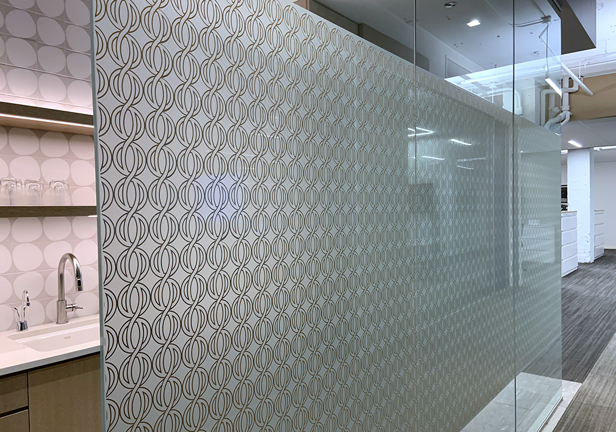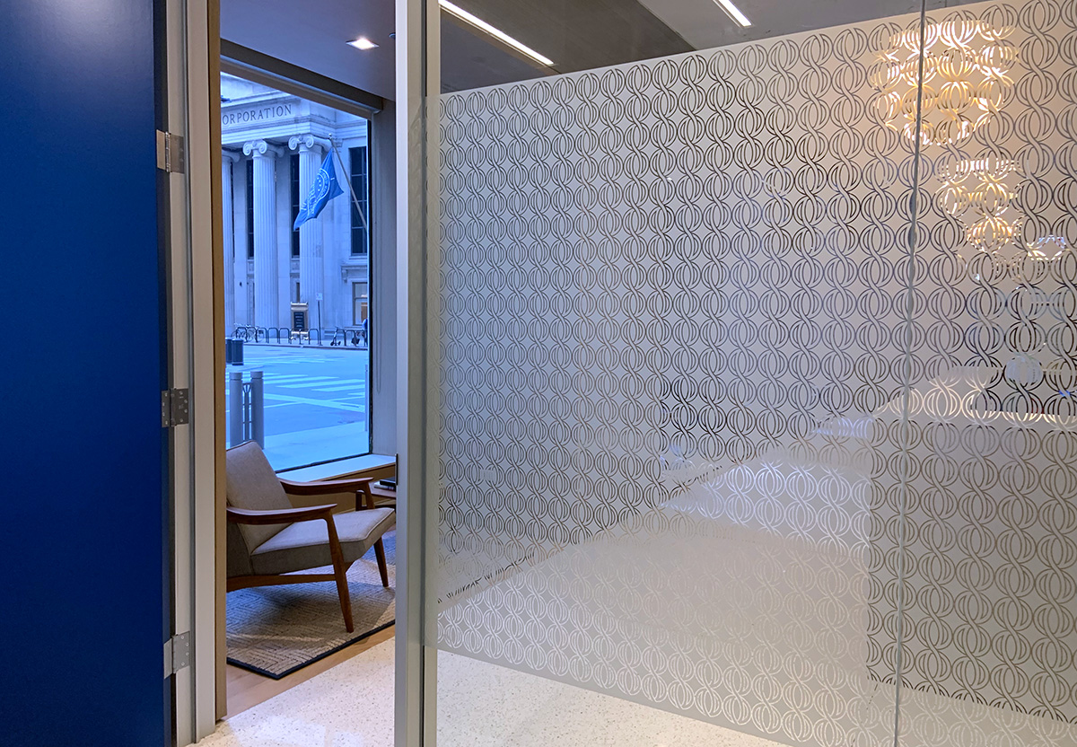 We modernized the brand identity starting with an evaluation of the logo. Historically, the logo had been built with an older serif font, reminiscent of classic old banking. We completely redrew the font as original sans serif artwork, with clean modern shapes and refined proportions. The actual circular logo art was redrawn with a thinner stroke, so it could scale easier in smaller digital formats. The circle logo artwork became the basis of a geometric pattern that formed privacy screens on inside and outside windows. We worked with the architect and signage company to align the brand elements with the build out of the new space.
