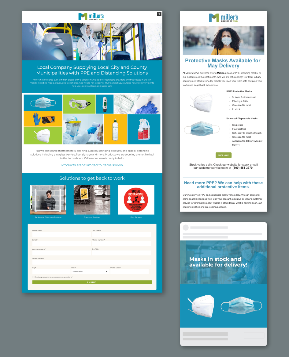 We support Miller’s in multiple ways. We develop turnkey campaigns through email marketing that focus on a series of products. These emails point the user to a landing page where they can link through to purchase products. We develop the creative and production for all campaigns, analyzing the results from the user’s journey. We also create social media posts and banner ads for additional campaign assets.