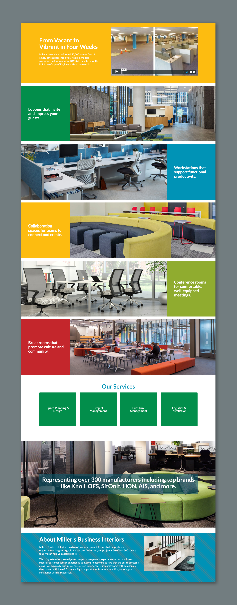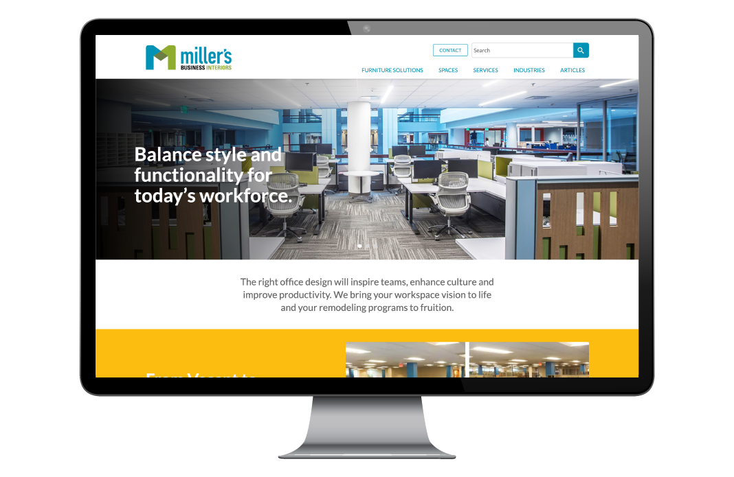 Furniture and design is a large part of Miller’s business. We built an additional website that focused solely on furniture and the services they offer. The furniture website is organized by many different industries, featuring top suppliers and solutions. Miller’s can get an organization into a new space so quickly, we had a time lapse created to show the speed and efficiency of a move into the office.