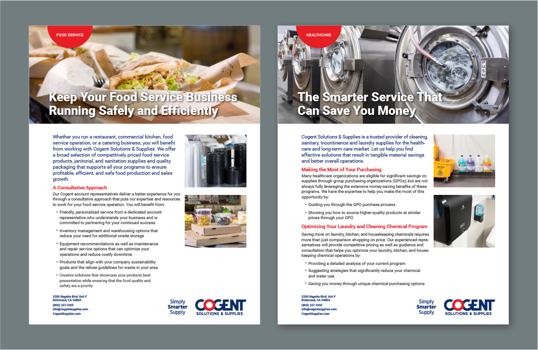 Photography played a key role in the brand strategy. Cogent needed to show their products in action at their specific customer locations. This involved coordinating photoshoots in 15+ locations shooting examples of everything from packaging products to large machines in action. We shot video at the same time so we could build mini movies detailing the type of products Cogent sells.