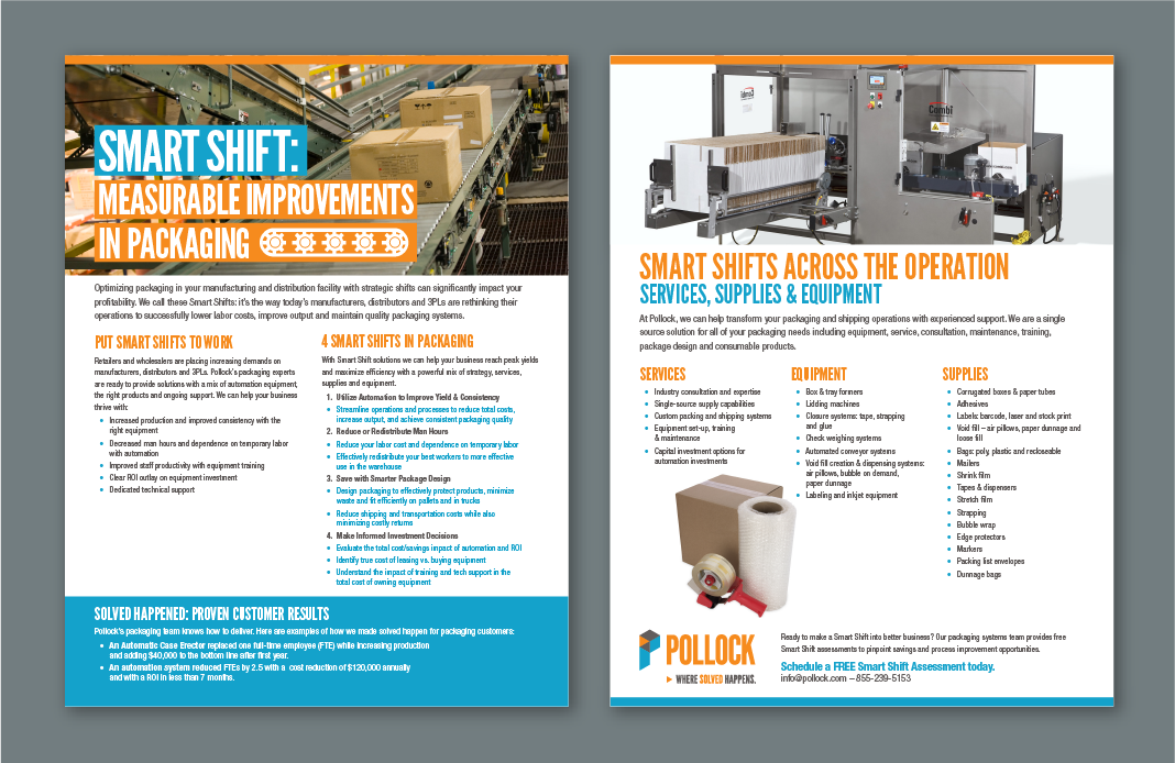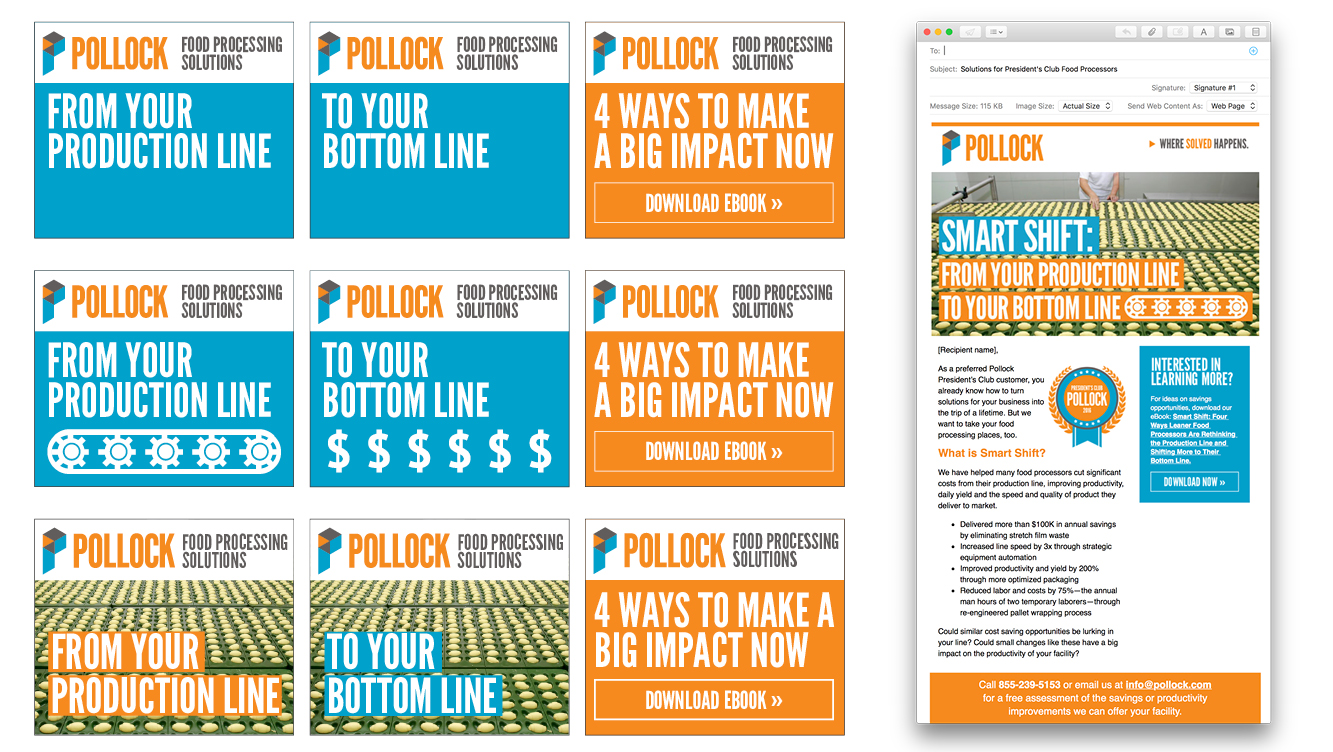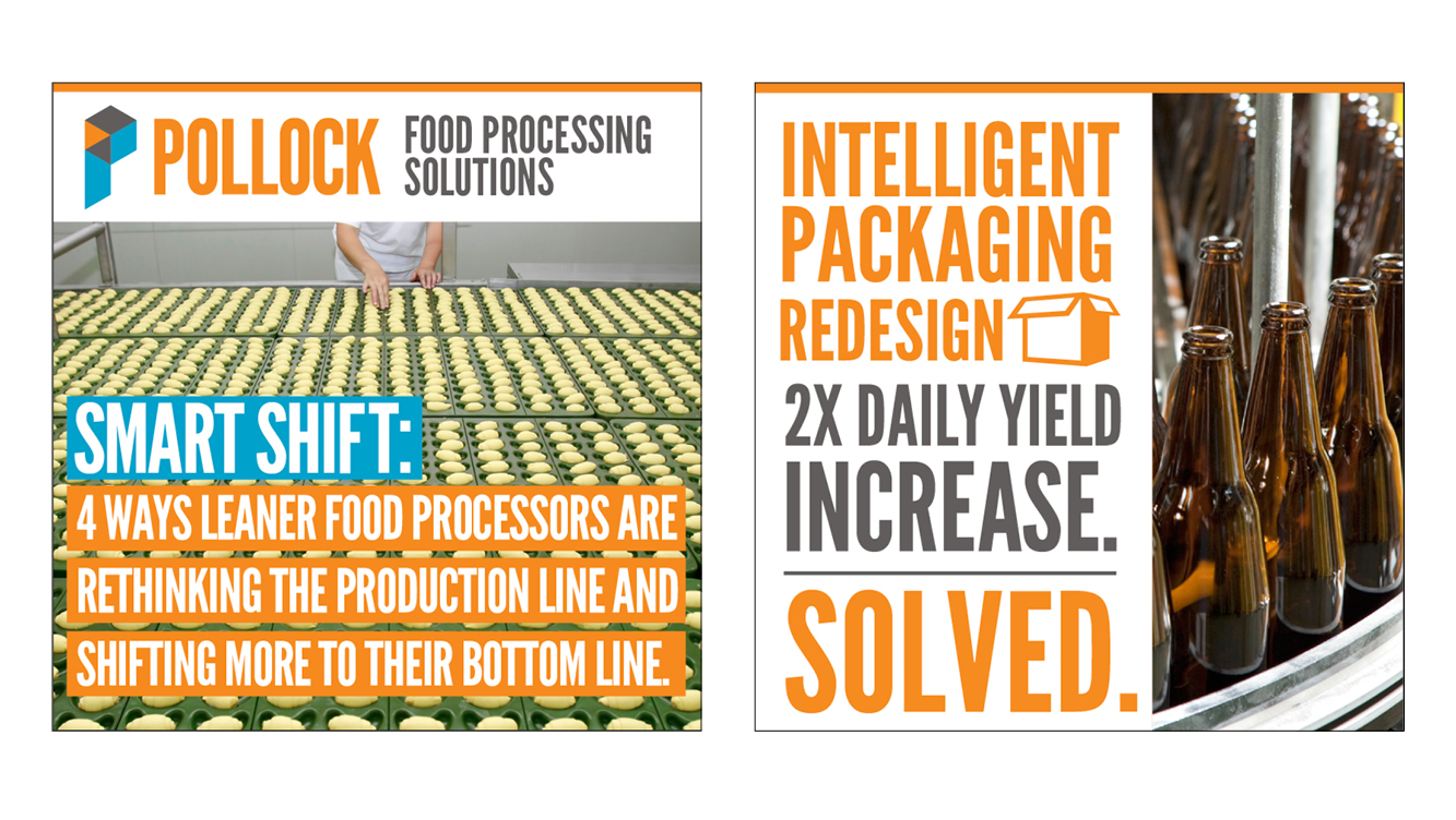 We helped Pollock identify industry trends when we created a campaign about food production focused on the “Smart Shift” with new production opportunities. The campaign showed customers multiple ways to think about production challenges and how Pollock could shift thinking to a new solution. This campaign was supported by digital ads, direct mail and a microsite.